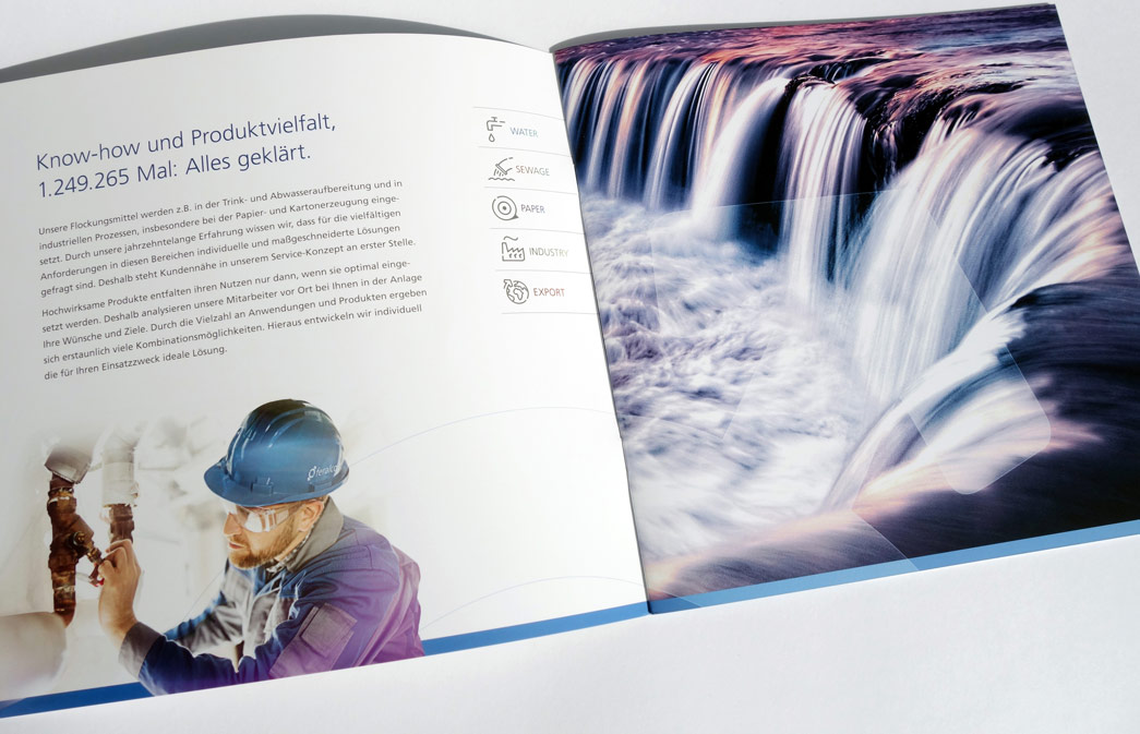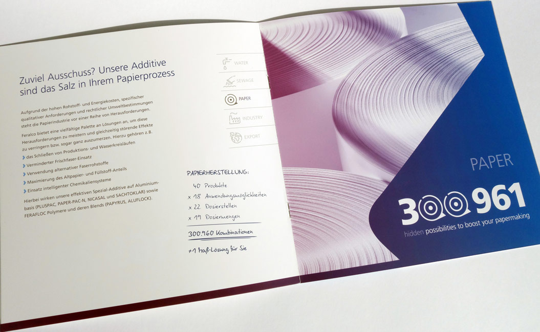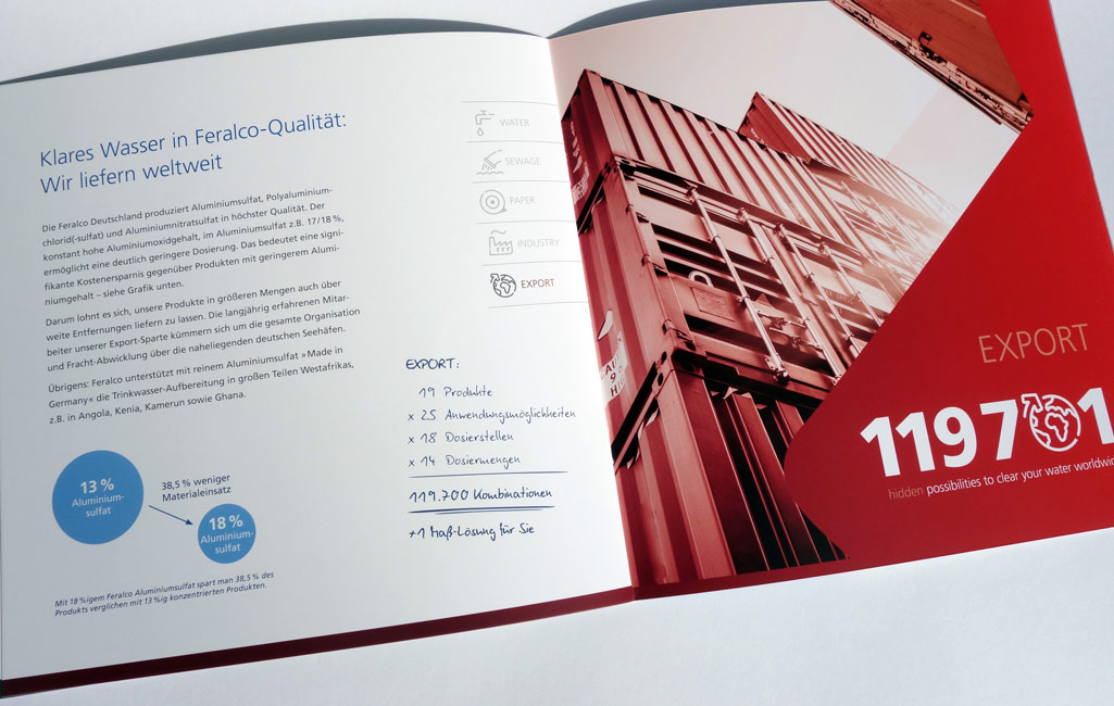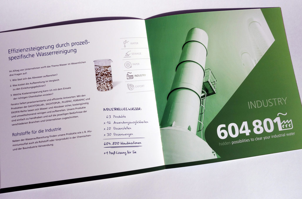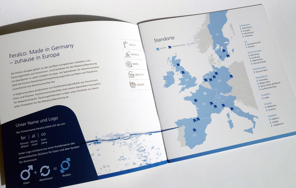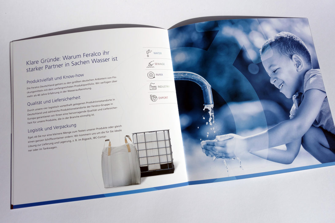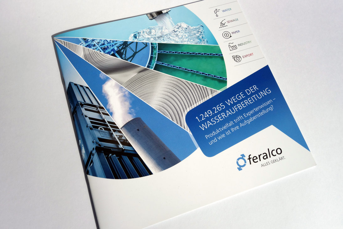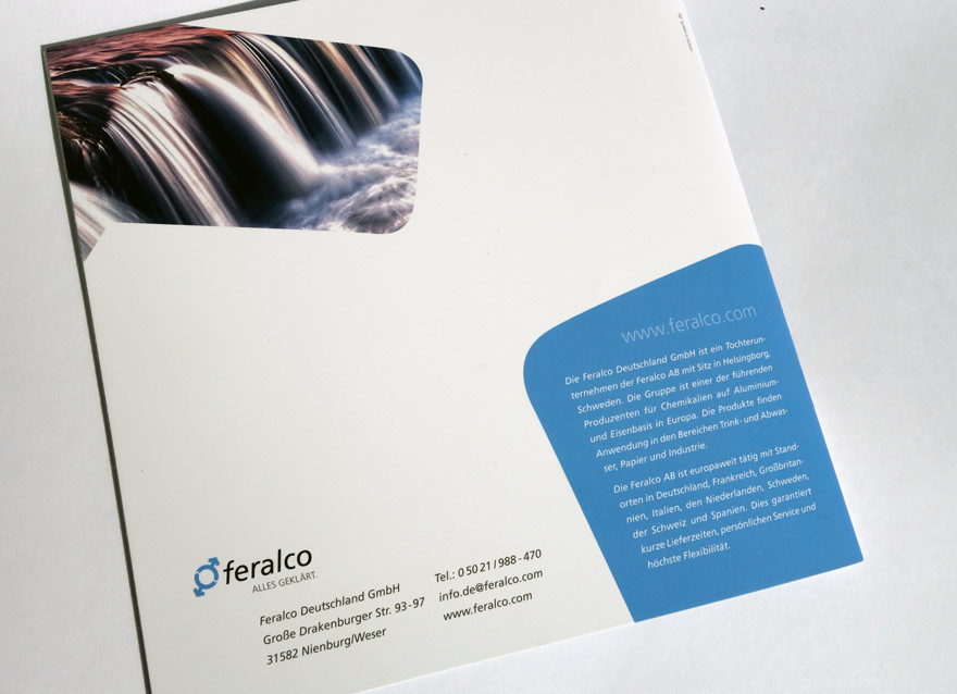 Konzept und Gestaltung einer Imagebroschüre für FERALCO, einen Produzent für (Trink-)wasser-Chemie. Die neuen Corporate-Design Elemente wurden hier angewandt und weiterentwickelt und prägen den neuen Markenauftritt.