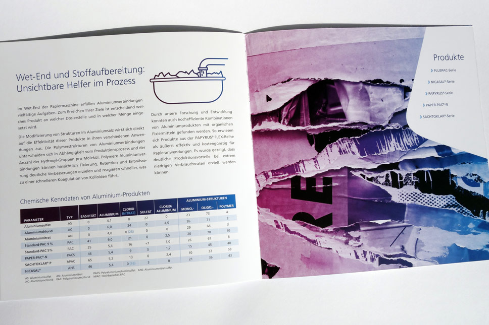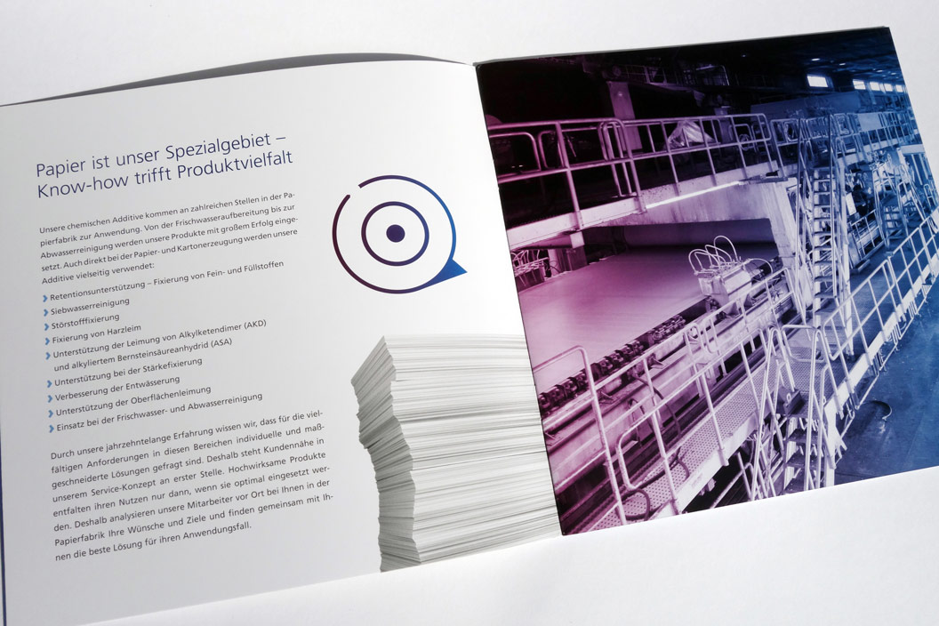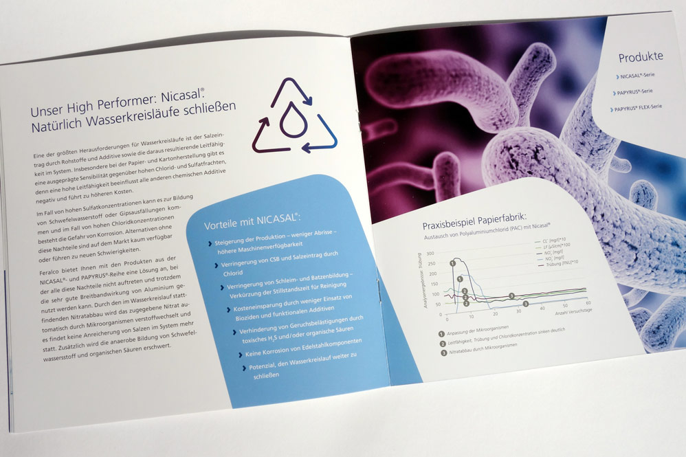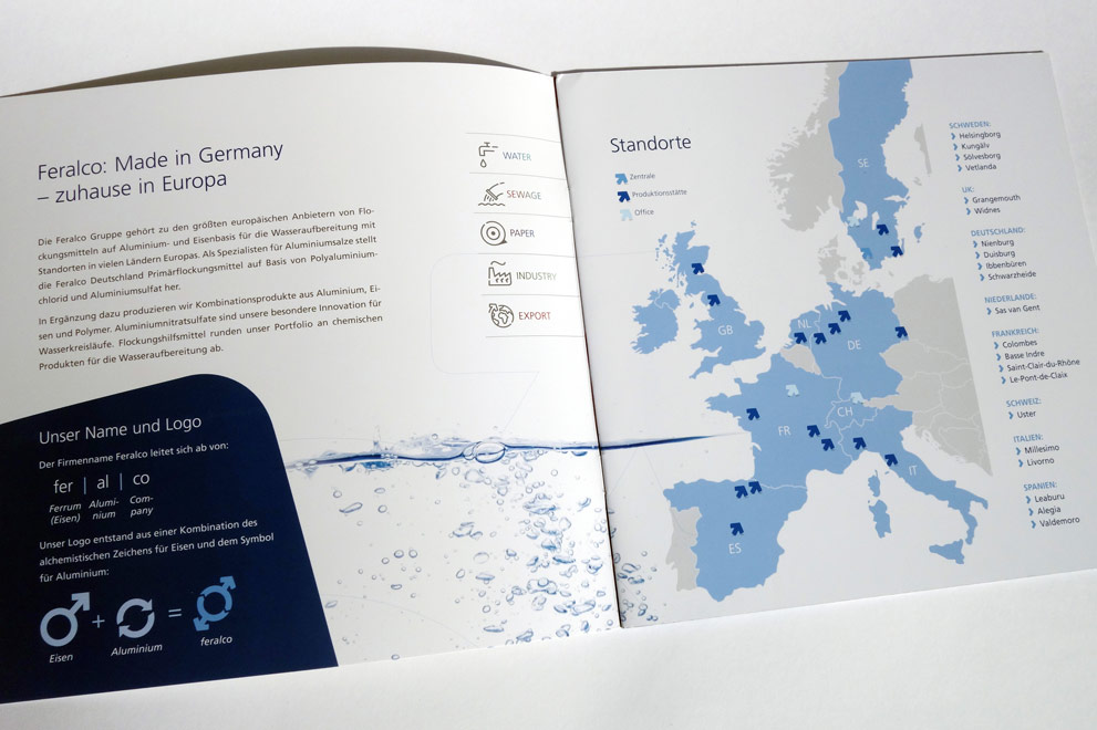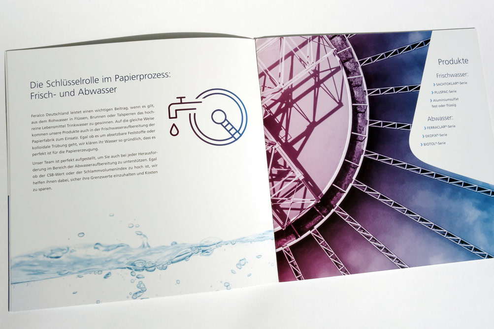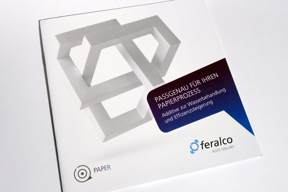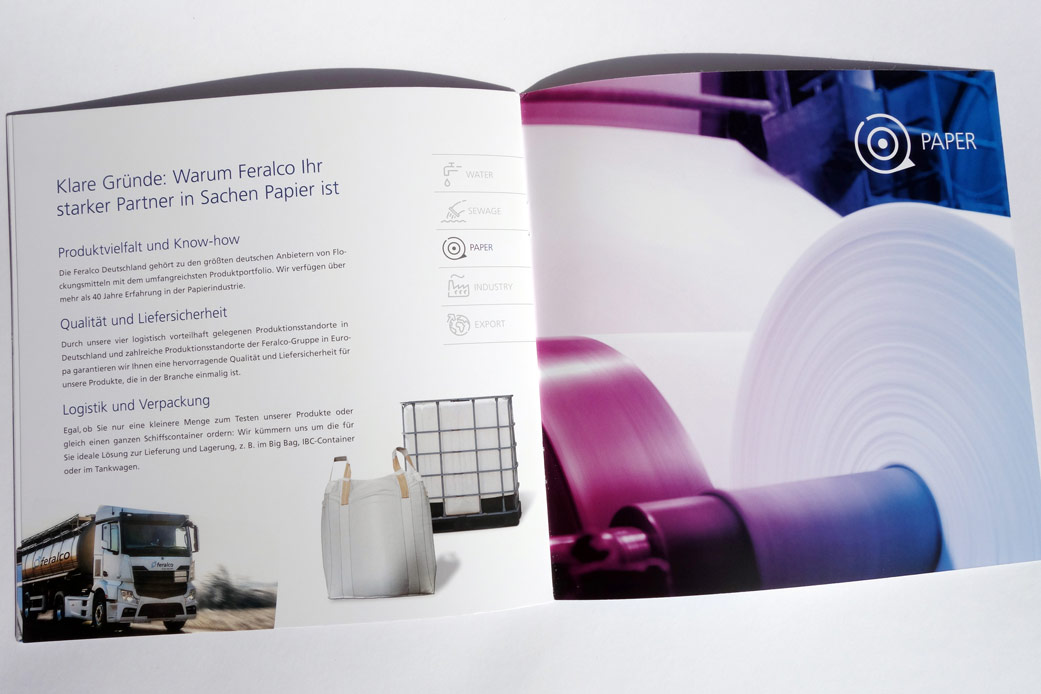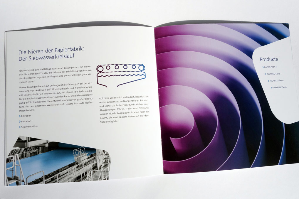 Konzept und Gestaltung einer Broschüre für Business-Unit »Papier« der FERALCO, einem Produzent für (Trink-)wasser-Chemie. Die neuen Corporate-Design Elemente wurden hier angewandt und weiterentwickelt und prägen den neuen Markenauftritt.