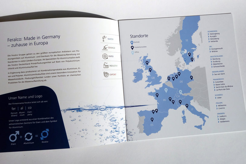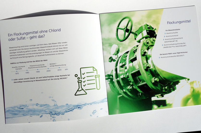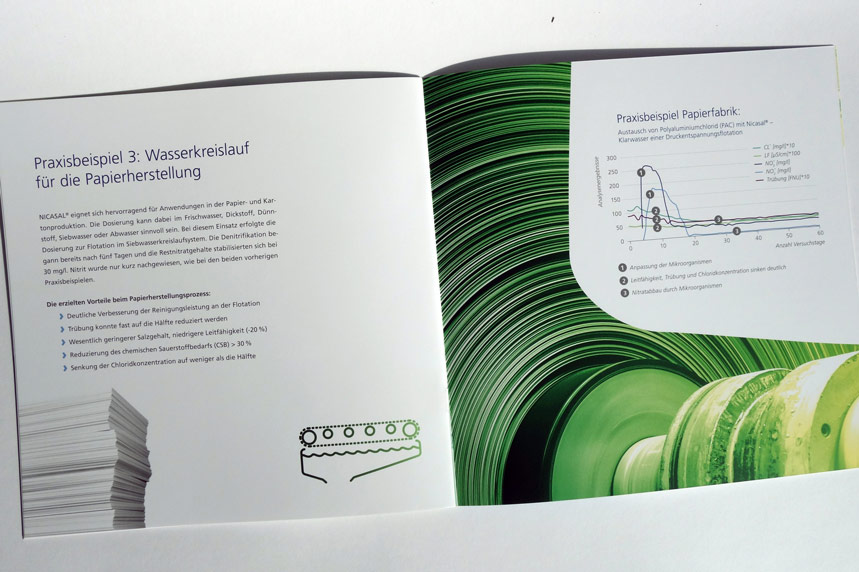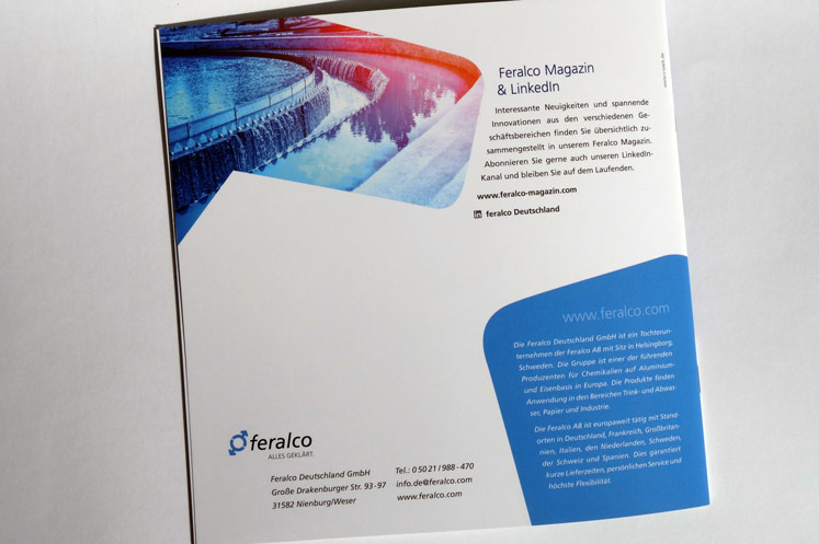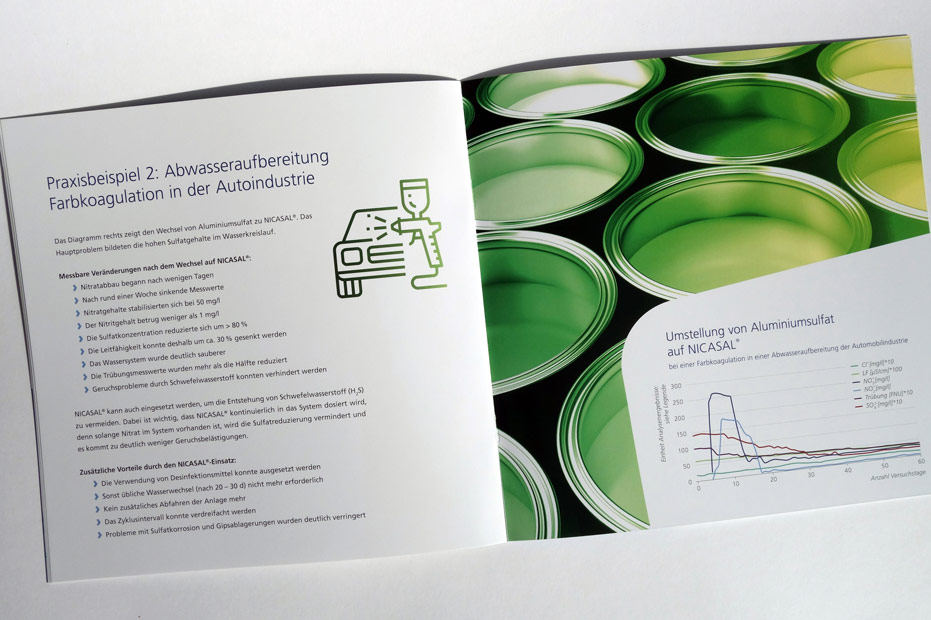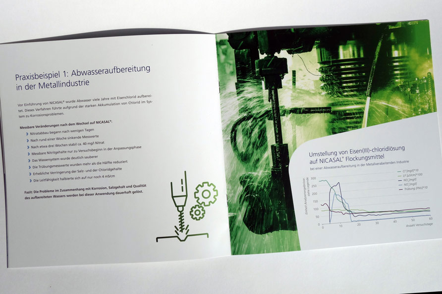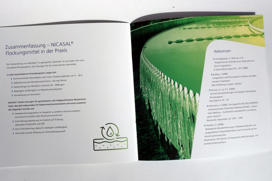 Konzept und Gestaltung einer Broschüre für das Premium-Produkt NICASAL der FERALCO, einem Produzent für (Trink-)wasser-Chemie. Die neuen Corporate-Design Elemente wurden hier angewandt und weiterentwickelt und prägen den neuen Markenauftritt.