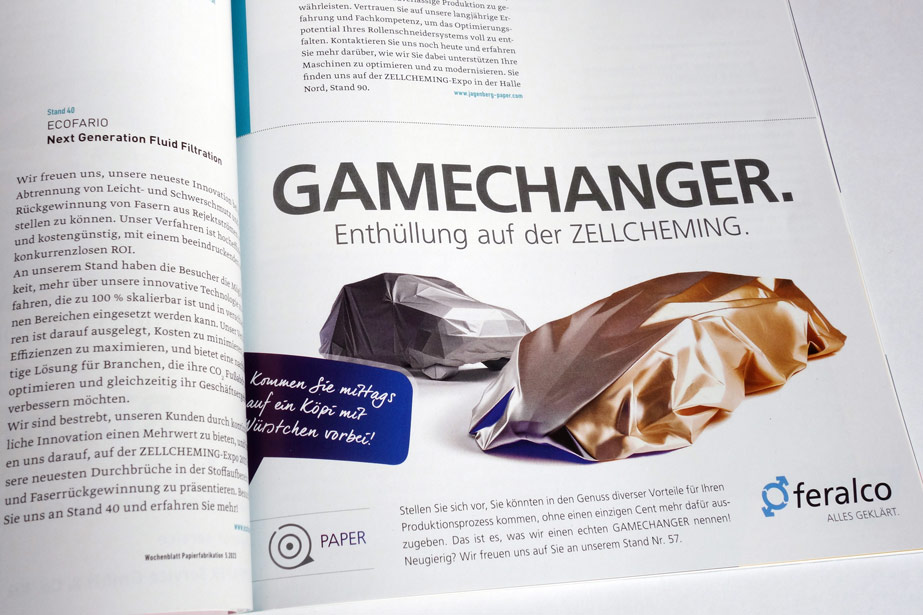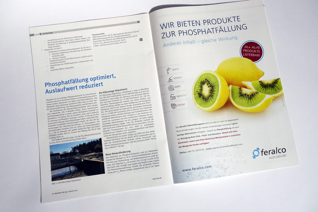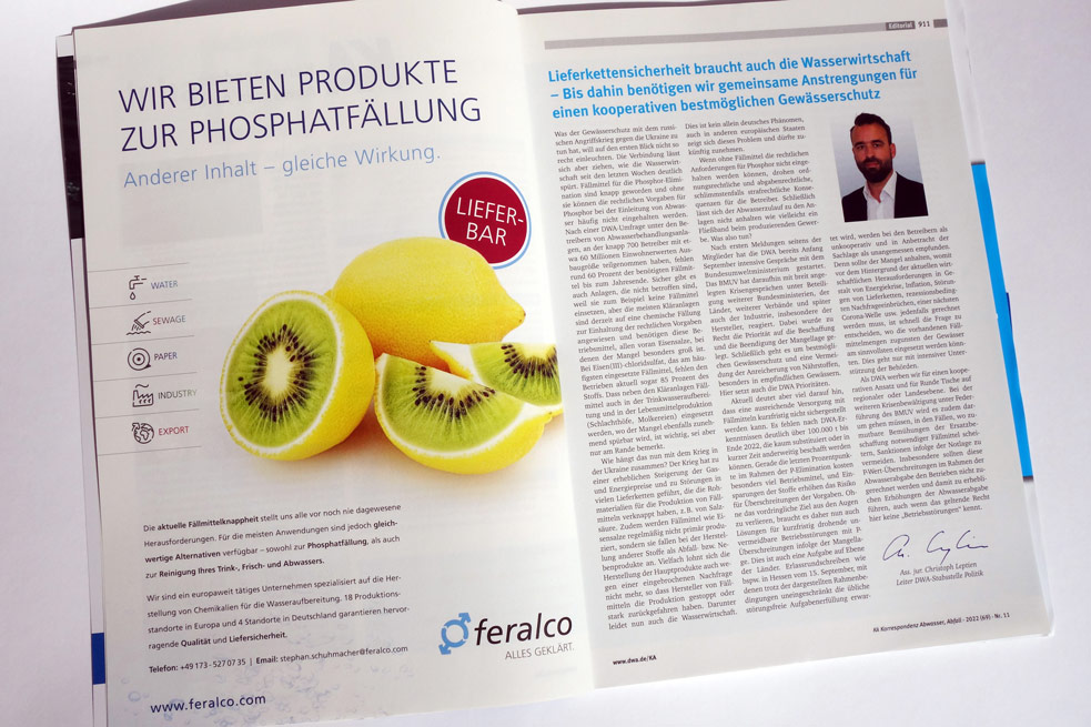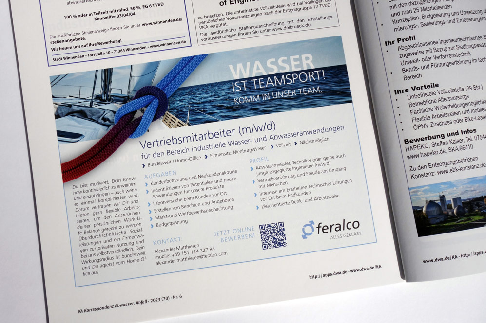 Konzept und Gestaltung von Anzeigen in Fachzeitschriften für unseren Kunden FERALCO, einen der marktführenden Produzenten für (Trink-) Wasserchemie.