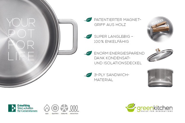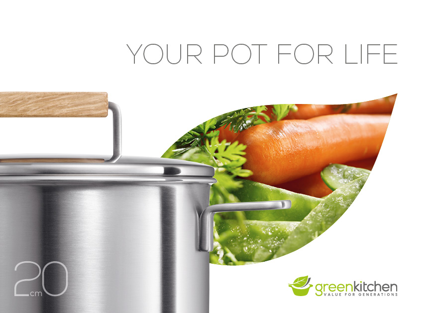 Die Firma GreenKitchen produziert und vertreibt nachhaltiges Premium-Kochgeschirr. Wir entwickelten ein Erscheinungsbild für den Markenauftritt, das prägnant, produkt- und zielgruppengerecht ist. In diesem Zuge haben wir ein aufwändiges Fotoshooting organisiert und begleitet. Mit dem Bildmaterial haben wir zunächst die Verpackungen gestaltet.