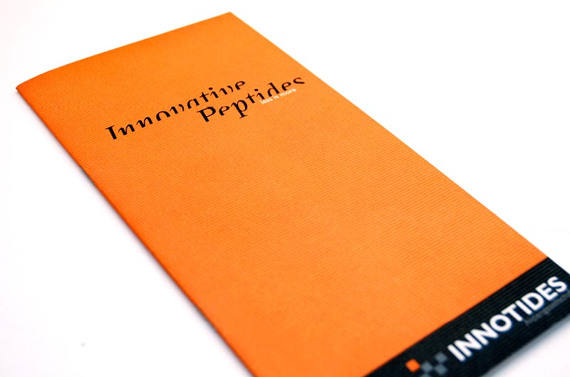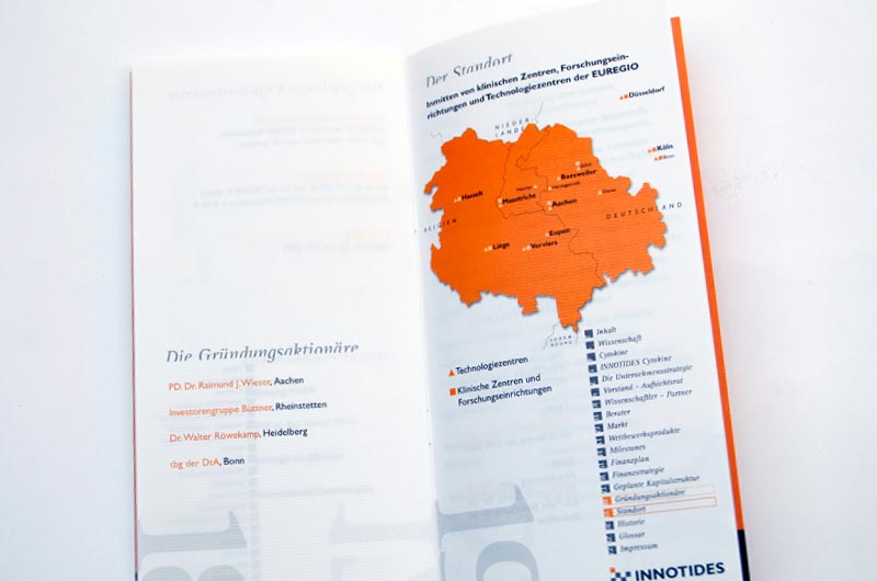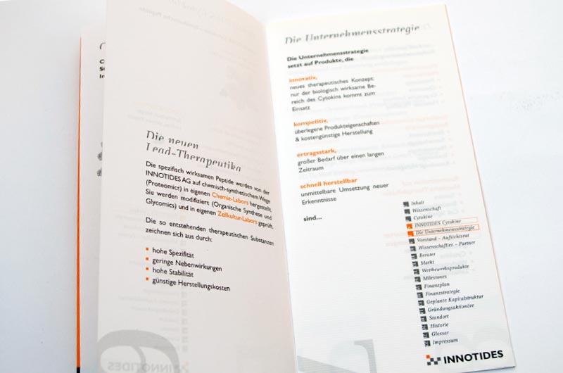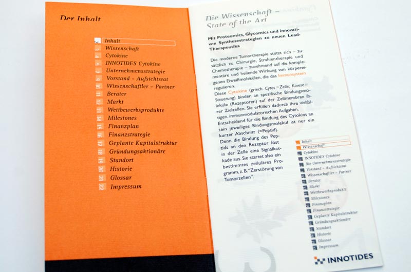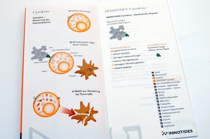Folder für ein Biotech-Unternehmen, das innovative Methoden zur Krebsbekämpfung entwickelt hat. Die Broschüre richtet sich insbesondere an Venture Capital Unternehmen.