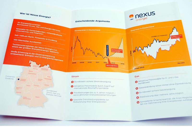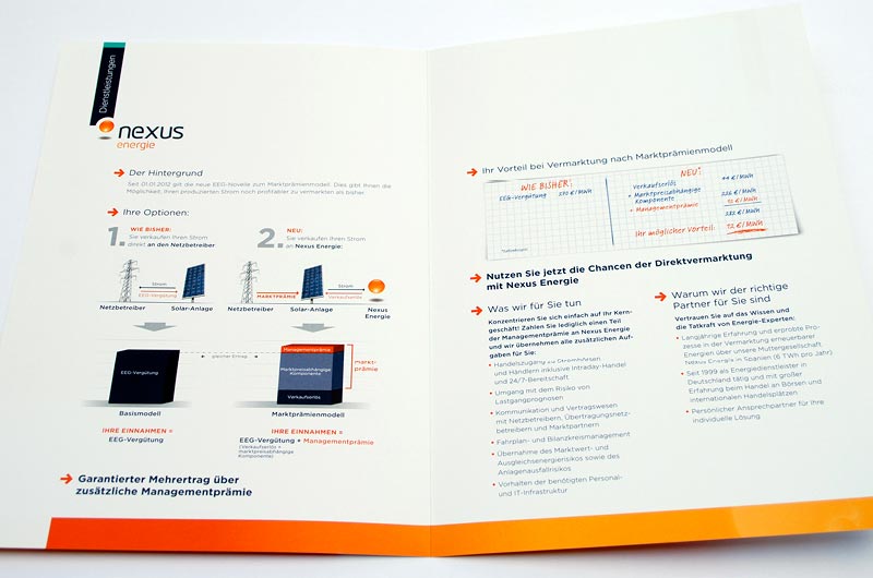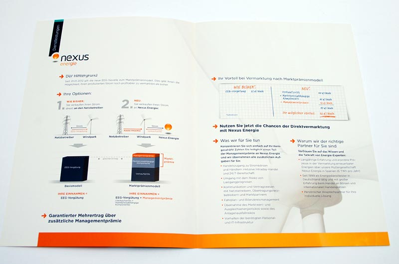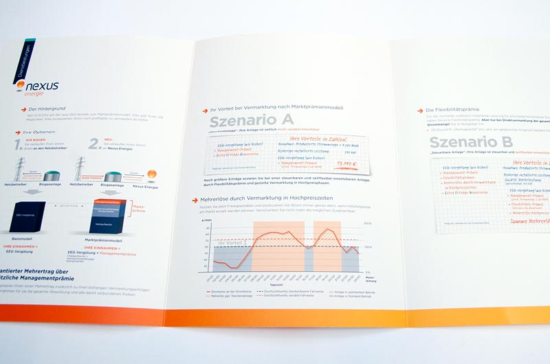 Diverse Folder zum Thema Alternative Energien, die sich an Energieerzeuger wenden. Anhand von Grafiken wurden Schritt für Schritt komplexe Sachverhalte erklärt.