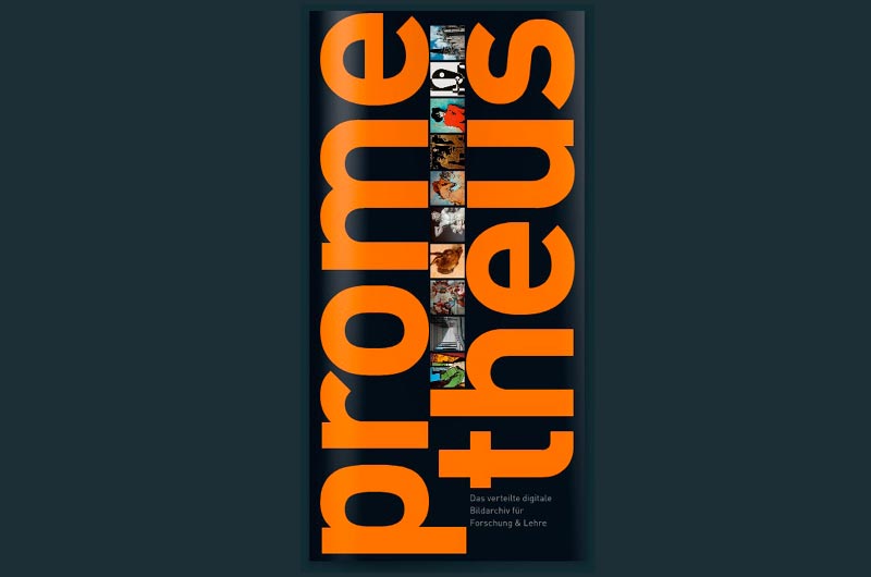 Flyer, der die Benefits von Prometheus, dem größten digitalen Bildarchiv für Kunst und Kultur, herausstellt.
