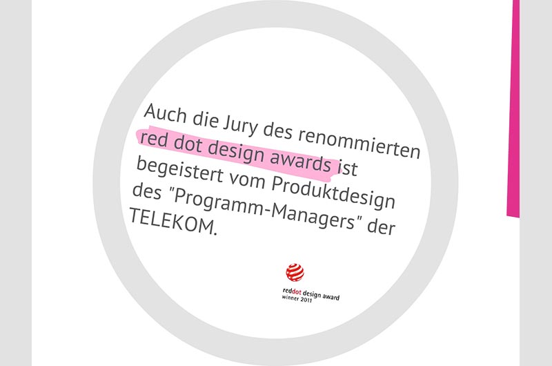 Entwicklung einer Präsentation für den neuen "Programm-Manager" der Telekom (Pitch). Um dem Storytelling eine besondere Lebendigkeit zu verleihen, haben wir hier mit der innovativen Zooming-Präsentations-Software "Prezi" gearbeitet.